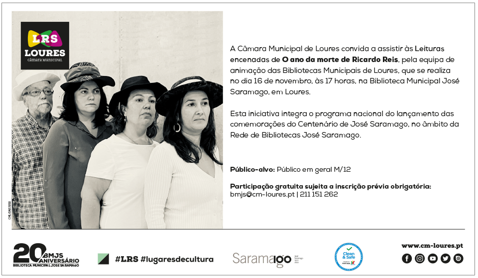 Leituras encenadas “O ano da morte de Ricardo Reis”, Biblioteca Municipal José Saramago de Loures, 16 de novembro, 17h00 Escrito por:saraloures9 de Novembro de 202110 de Novembro de 2021Posted inSem categoria Partilhar isto: Click to share on X (Abre numa nova janela) X Clique para partilhar no Facebook (Abre numa nova janela) Facebook Gosto Carregando... Relacionado