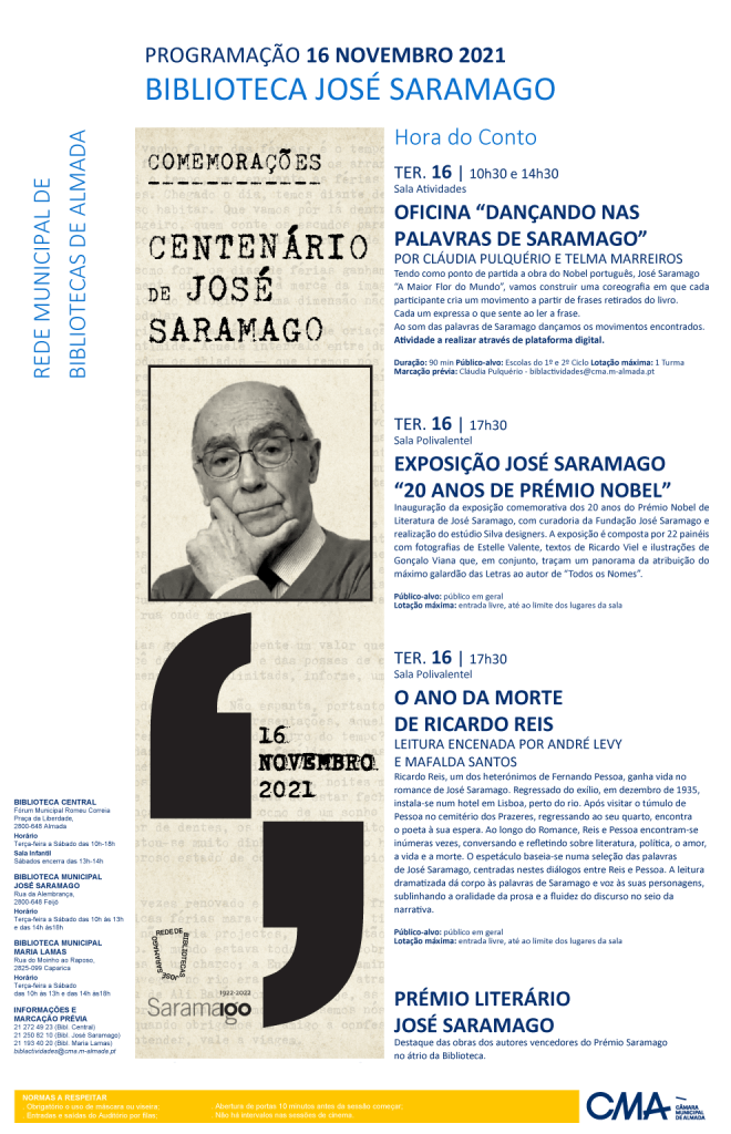 Em Almada, a Biblioteca Municipal José Saramago, no Feijó, será palco, no dia 16 de novembro de 2021, de um conjunto de eventos que assinalam o início das comemorações dos 100 anos do Nobel da Literatura português.