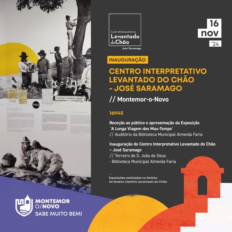 Em Montemor-o-Novo, pelas 16h45, está agendada a receção ao público na Biblioteca Municipal, seguida da apresentação da exposição ‘A Longa Viagem do Mau-Tempo’. A tarde termina em grande, com a inauguração do Centro Interpretativo Levantado do Chão – José Saramago.